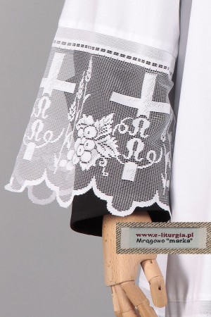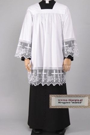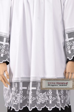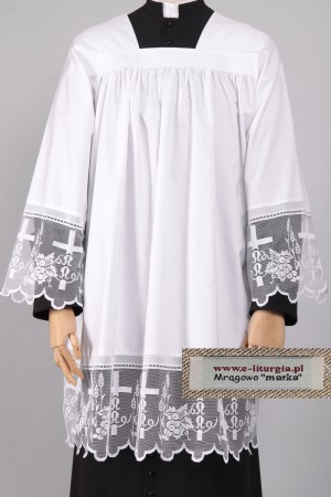 Sobrepeliz para padres - branco com belas decorações que lhe conferem elegância e leveza. A parte inferior e as mangas do traje são decoradas com um encaixe irregular e perfurado em tecido de poliéster. O subtil motivo litúrgico da cruz rodeada de vinhas e espigas de trigo é muito decorativo. Um excedente feito em um estilo simples com um jugo e rugas. Oferecido em dois tipos de material: algodão com viscose e gabardine (poliéster).
